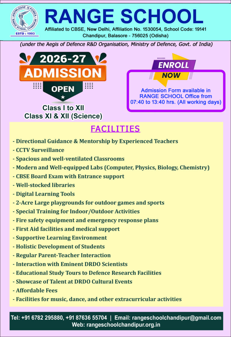 Range school, Chandipur is a day school under the aegis of DRDO, Ministry of Defence. It started functioning in the month of May 1993 to cater educational needs of the employees of the DRDO, Chandipur, Balasore.